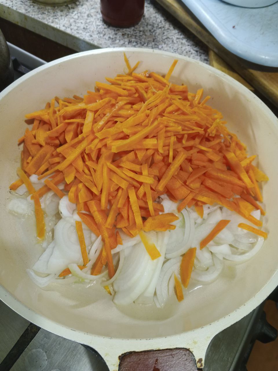 Закидываем на сковороду одновременно нарезанные лук и морковь